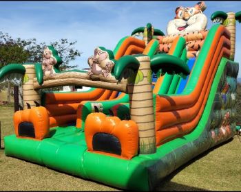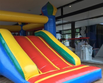 Cliente optou pela escolha de dois brinquedos, sendo uma Cama Elástica Extra Grande colorida e um Pula Pula 2x1. A Cama elástica suporta o peso de até 220Kg aproximadamente e na area de salto, o brinquedo comporta até 5 crianças pequenas ou 2 adultos por vez. O segundo brinquedo escolhido foi o Pula Pula 2x1, fazendo a função de brinquedos multi atividades. A entrada e a saida são de lados opostos e no interior do brinquedo, além do pula-pula. possui obstáculos. Na saida, uma rampa por onde as crianças descem escorregando.