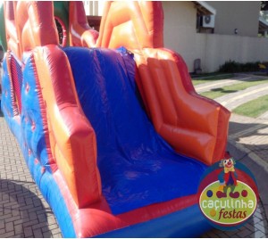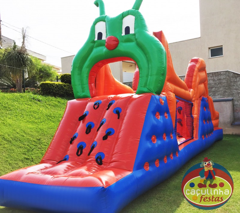 Brinquedo interativo com duas rampas de escalada, um escorregador e no centro um pula-pula